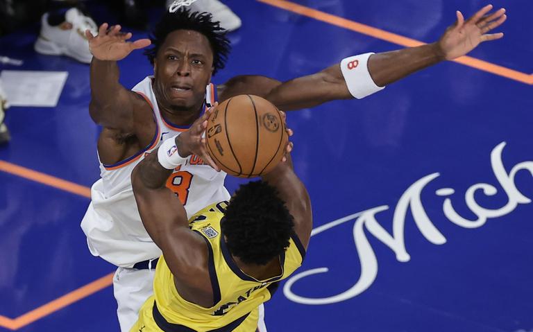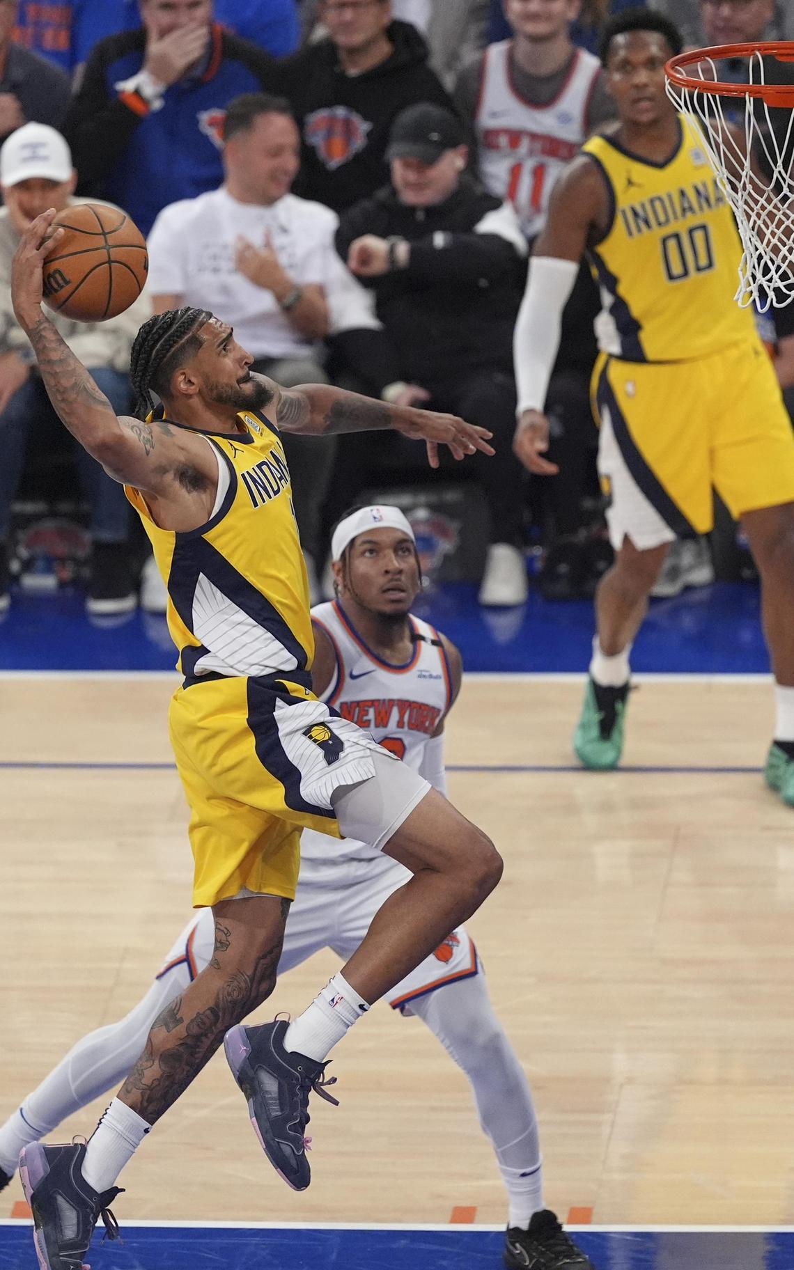 Indiana Pacers guard Bennedict Mathurin (00) puts up a shot against New York Knicks forward OG Anunoby (8) during the second quarter of Game 1 of the NBA basketball Eastern Conference final, Wednesday, May 21, 2025, in New York. (AP Photo/Adam Hunger)